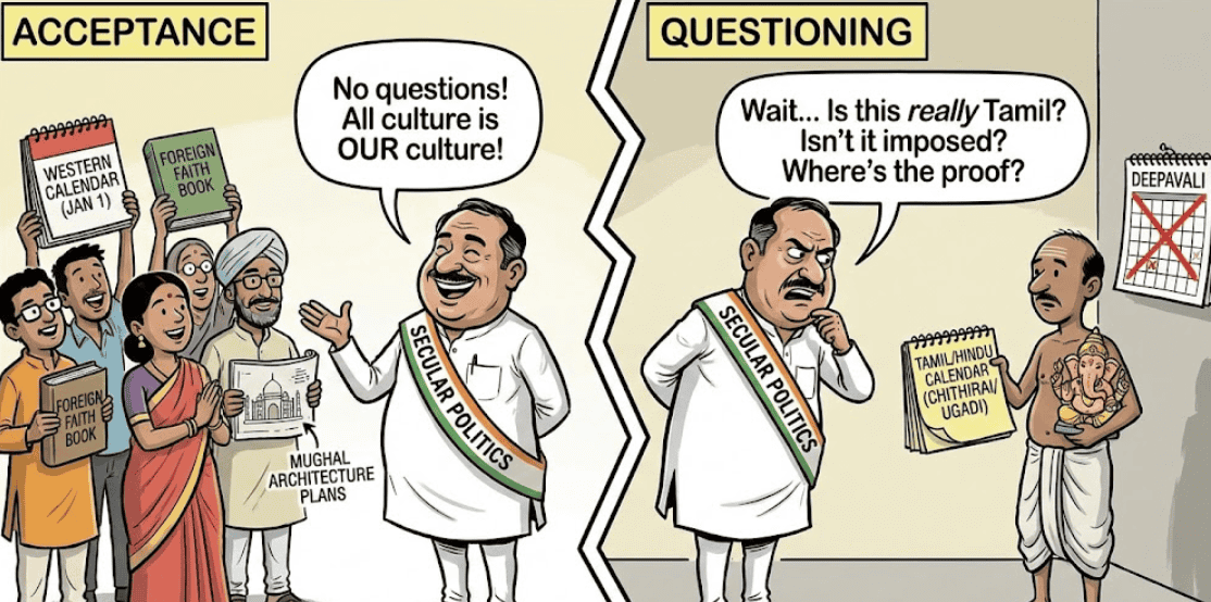 நோன்புக் கஞ்சி குடித்துவிட்டு, கிறிஸ்துமஸ் பண்டிகைகளுக்கு மட்டும் தயக்கமின்றி வாழ்த்துச் சொல்லிக்கொண்டு மதச்சார்பின்மை பேசிவிட்டு, ‘தமிழர்கள் இந்துக்கள் இல்லை‘ என்று பேசுகிற கூட்டத்திடம் நாம் முன்வைக்கும் சில கேள்விகள்: