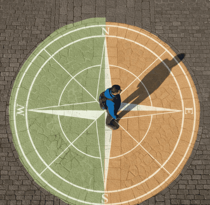 அந்த வட்டத்தில் நிற்கும் மனிதர் கிழக்கு நோக்கிப் பார்க்கிறார்.அவர் பார்க்கும் திசையில், மெல்லிய ஆரஞ்சு நிறத்தில் இருக்கும் அந்த அரைவட்டத்தின் 0 முதல் 180 பாகையும் கிழக்கு தான். அதில் 90 பாகையில் இருப்பது தான் நேர் கிழக்கு.