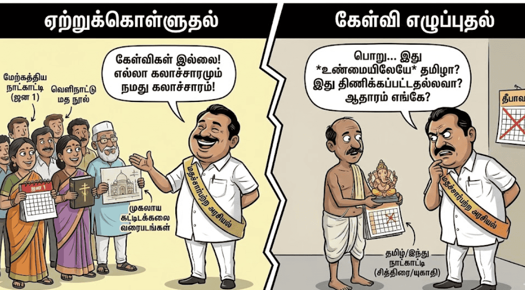 நோன்புக் கஞ்சி குடித்துவிட்டு, கிறிஸ்துமஸ் பண்டிகைகளுக்கு மட்டும் தயக்கமின்றி வாழ்த்துச் சொல்லிக்கொண்டு மதச்சார்பின்மை பேசிவிட்டு, ‘தமிழர்கள் இந்துக்கள் இல்லை‘ என்று பேசுகிற கூட்டத்திடம் நாம் முன்வைக்கும் சில கேள்விகள்: