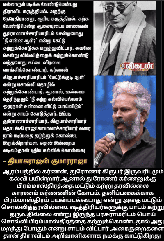 இந்த சமூக ஊடகங்கள் கொண்டாடும் அறிவாளி இயக்குனர்களில் ஒருவரான தியாகராஜ குமராஜா இந்த ‘கல்வியில் சிறந்த தமிழ்நாடு’ விழாவில், இந்தியா குடியரசு ஆனதற்கு பின் குறிப்பாக திராவிட இயக்கங்கள் ஆட்சிக்கு வந்த பின் அந்த இயக்கம் தமிழகத்தில் கல்வியின் வளர்ச்சிக்கு என்ன செய்திருக்கிறது என்று பேசாமல் அல்லது அதைப்பற்றி பேசுவதற்கு ஒன்றும் இல்லாமல். “எல்லோரும் படிக்க வேண்டுமென்பது திராவிட கருத்தியல் ஆரிய கருத்தியல் அதற்கு நேரெதிரானது. கற்கவேண்டுமென்ற ஆசையுடைய மாணவன் துரோணாச்சாரியாரிடம் சென்ற பொழுது நீ என்ன ஆள் என்று கேட்டு கற்றுக்கொடுக்க மறுத்துவிட்டார். அவனே சென்று கற்றுக்கொண்டு வந்த பொழுது கட்டைவிரலை வாங்கிக்கொண்டார்.கர்ணன் கிருபாச்சாரியாரிடம் மேட்டுக்குடி ஆள் என்று பொய் சொல்லி தொழில் கற்றுக்கொண்டார். ஆனால், உண்மை தெரிந்ததும் நீ கற்றது உன்னை விட்டு போய்விடும் என்று சாபம் கொடுத்தார் இப்படி துரோணாச்சாரியார் ஆரம்பித்து ராஜகோபாலாச்சாரி வரை நாம் படிப்பதை தடுத்துக்கொண்டே இருக்கிறார்கள்.” என்று அந்த தியாகராஜா குமாரராஜா பேசியிருக்கிறார்.வியாசர் எழுதிய மஹாபாரதத்தில் இருந்து பாத்திரங்களின் பெயர்களை மட்டும் உருவிக்கொண்டு இவர் ஒரு கதை செய்து பேசியிருக்கிறார்.