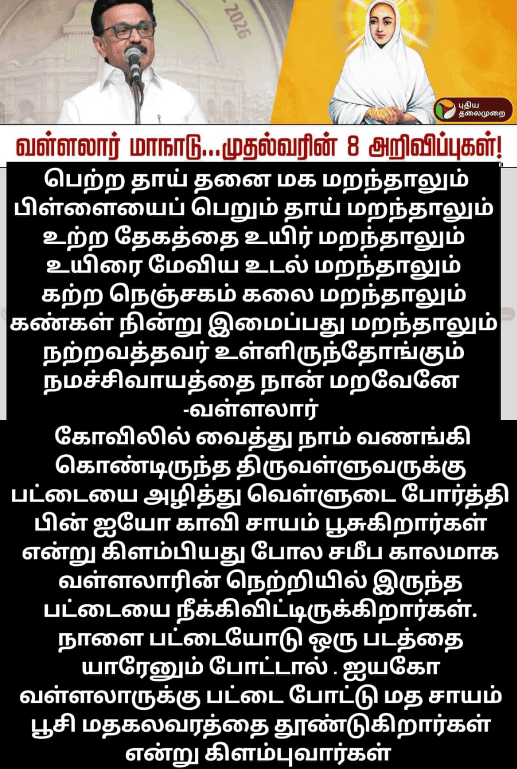 என்றேனும் வெறும் நெற்றியோடு சென்றால், என்னுடைய ஆசிரியர் “நெற்றியை நாய் நக்கிவிட்டதா?” என்று கேட்பார். திராவிடக் கூடாரம், வள்ளலார் நெற்றியில் இருந்த விபூதியை அவ்வாறாகவேதான் துடைத்து எடுத்து இருக்கிறது.உன் ஆசிரியர் ஆரிய வந்தேறியாக இருப்பார் என்று நினைத்துவிடாதீர்கள். ‘நீறில்லா நெற்றி பாழ்’ என்று ஔவையார் பாடியிருக்கிறார்.
